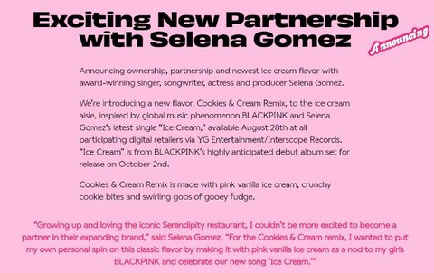 Serendipity diye bir marka Selena ile çalışıyor ve özel SelPink dondurması çıkaracaklar