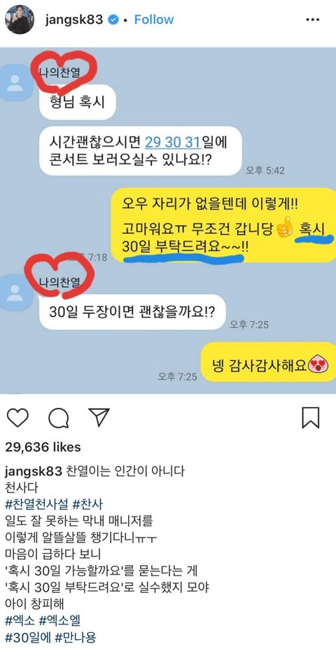 Chanyeolie’m: Hyung merak ediyorum, vaktin varsa eğer 29, 30 ya da 31’indeki konserime gelebilir misin?