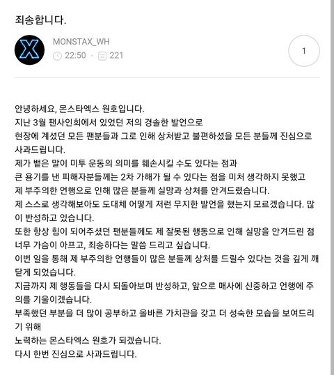 Dün Starship özür diledi ve bugün Wonho fancafeye bunu yazdı