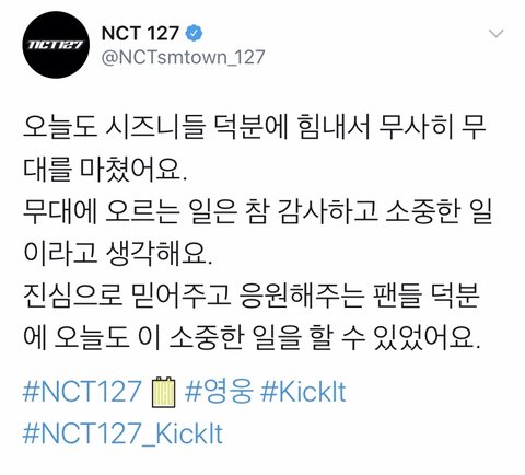 “Bugün en yakın arkadaşımızla birlikte sahneye çıkamadık, ama kalp ve ruhlarıyla bize inanan NCTzenler sayesinde yakın arkadaşımız performansı gurur duyarak izledi. İyi bir şekilde döneceğiz! Punch ve Kick It promosyonları boyunca müteşekkirdik”