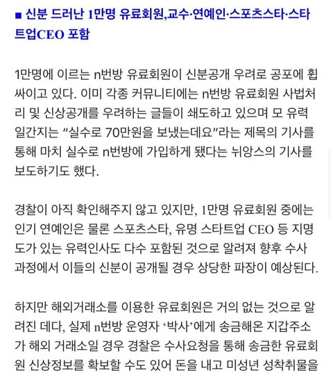 Nth room’daki üyeler kimliklerinin açıklanmasından korkuyor. Şimdiden bu üyelerin nasıl cezalar alabileceğiyle ilgili haberler çıkmaya başladı. Polis henüz onaylamasa da 10 bin üyenin içinde popüler ünlüler, spor starları, CEO ve diğer nüfuzlu isimlerin olduğu biliniyor”