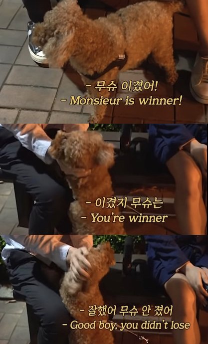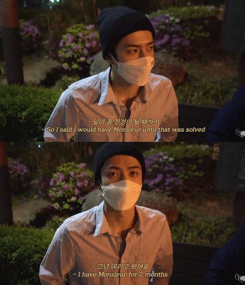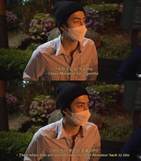 Sehun’un arkadaşı, sevgilisiyle birlikte köpeğe bakıyordu, ama ayrıldılar… köpeğin gidecek yeri olmadığı için köpeği Sehun aldı… Sehun’un kalbi sıcacık… umarım Monsieur yeni ailesi Vivi ve Sehun ile mutlu bir hayat yaşar