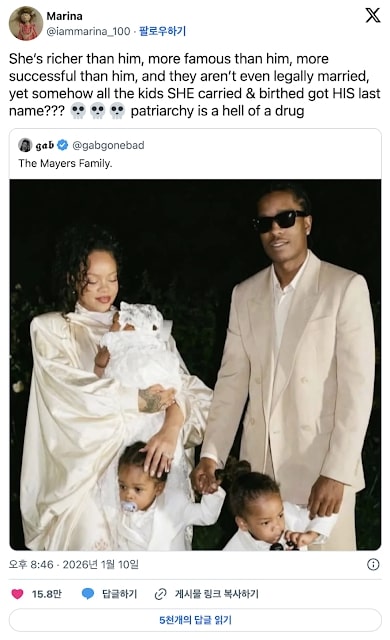 Rihanna ondan daha zengin, ondan daha ünlü, ondan daha başarılı ve yasal olarak evli bile değiller, ama nedense ONUN taşıdığı ve doğurduğu tüm çocuklar ADAMIN soyadını almış??? 💀💀💀 ataerkillik gerçekten korkunç bir şey