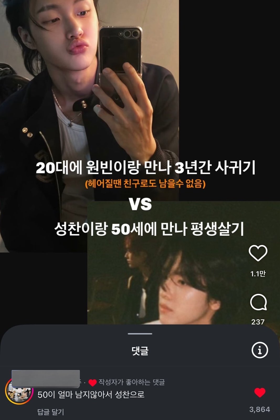 “20’li yaşlarında Wonbin ile 3 yıl çıkmak (ayrıldıktan sonra arkadaş kalamazsın) VS 50 yaşındaki Sungchan ile ömür boyu çıkmak”