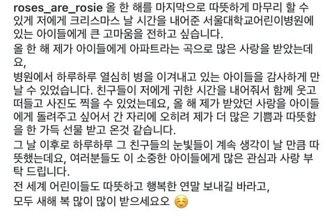 “Bu geçen yılı sıcak bir şekilde kapatmamı sağlayarak, Noel Günü bana zaman ayıran Seoul Ulusal Üniversitesi Çocuk Hastanesi’ndeki çocuklara en içten teşekkürlerimi sunmak istiyorum.