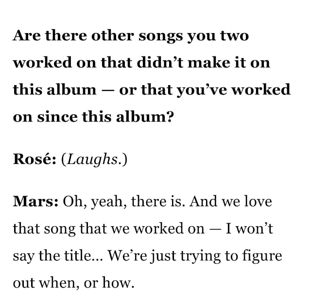 Mars: Evet, var. Üzerinde çalıştığımız o şarkıyı gerçekten çok seviyoruz — ama adını söylemeyeceğim… Sadece ne zaman ya da nasıl olacağını çözmeye çalışıyoruz.