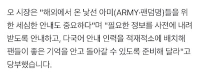 “Belediye Başkanı Oh, ‘Yurt dışından gelen ARMY’ler için ayrıntılı rehberlik sağlamak önemli’ dedi ve ‘Hayranların gerekli bilgileri önceden indirebilmeleri için yönlendirme yapılmasını ve doğru yerlere çok dilli rehberlerin yerleştirilmesini sağlayın ki iyi anılarla ülkelerine dönebilsinler’ diye ekledi.”