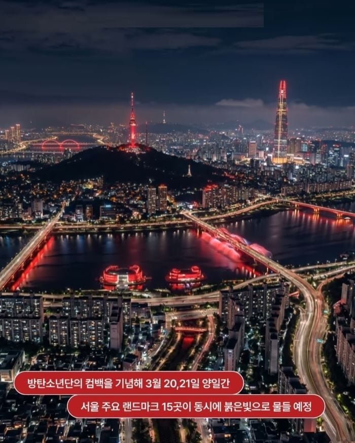 “BTS’in 20 Mart’taki geri dönüşünü kutlamak için Seul’ün 15 ikonik simge yapısının tamamen kırmızı ışığa bürünmesi planlanıyor”