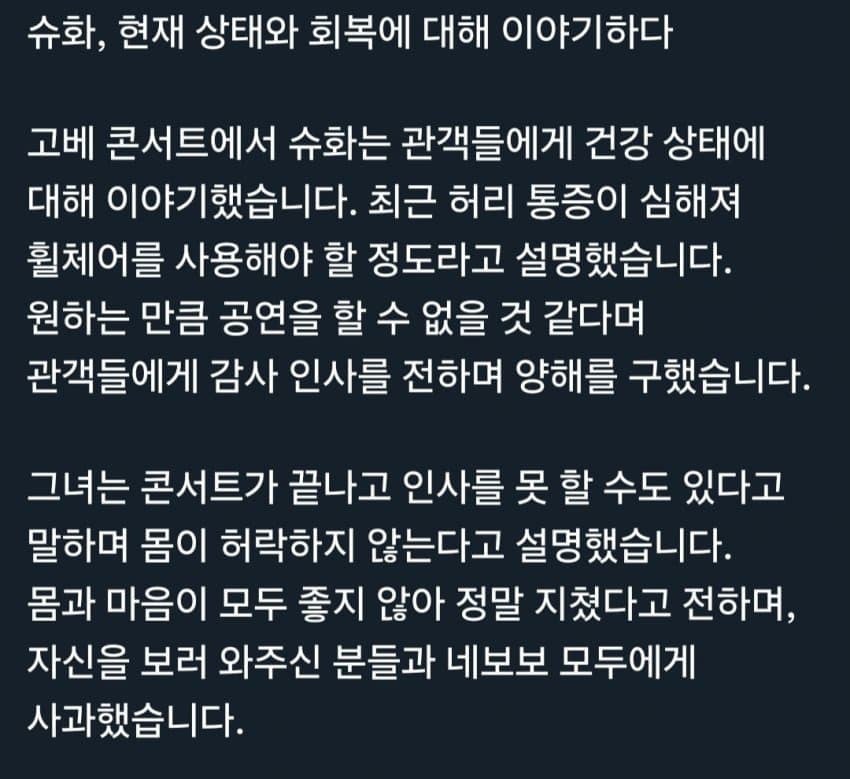 Shuhua, mesajında sırt ağrısının son zamanlarda çok kötüleştiğini ve bu yüzden tekerlekli sandalye kullanmak zorunda kaldığını açıkladı. Hayranlarına minnettarlığını ifade etti ve ağrısı nedeniyle istedikleri kadar sahnede olamayabileceğini belirterek anlayış istedi.