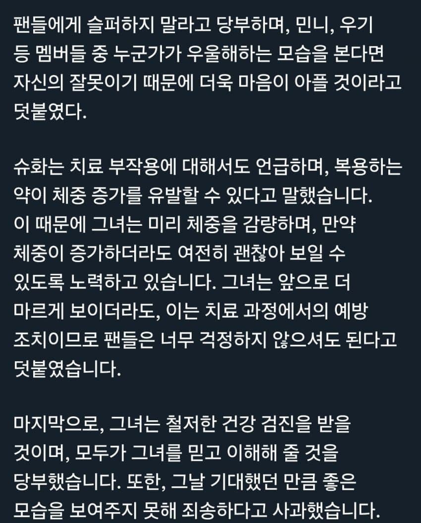 Ayrıca, eğer hayranlar Minnie veya Yuqi gibi üyelerin Shuhua yüzünden üzgün göründüğünü fark ederlerse, onlardan “üzülmemelerini” istedi; bunun kalbini “daha da kıracağını” çünkü bunu “tamamen kendi hatası” gibi hissedeceğini belirtti.
