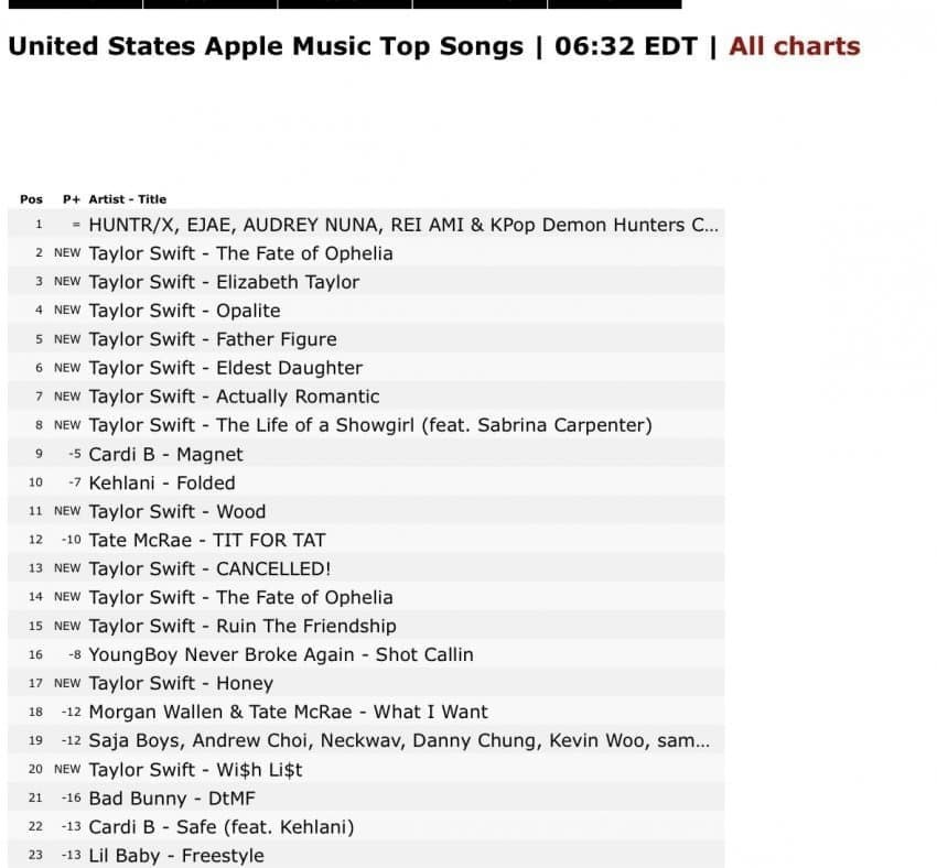 - Muhtemelen şaka amaçlı yazılmış ama henüz tamamen yansımadığı için sıralamalar yakında değişecek. Evet, görünüşe göre tarihteki ilk albümmüş ki tüm şarkıları aynı anda ABD Apple Music Top 20’ye girmiş.