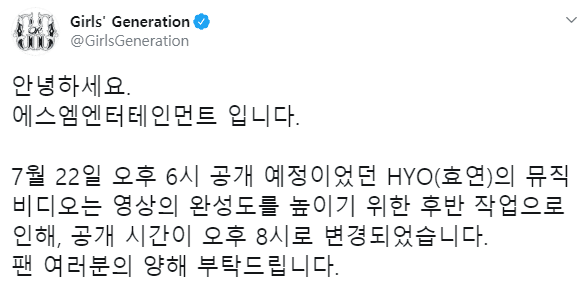 “Hyoyeon’un 22 Temmuz saat 6’da çıkacak klibi final versiyonun geliştirilmesi içi 8’e ertelendi. Hayranların anlayış göstermesini rica ediyoruz.”