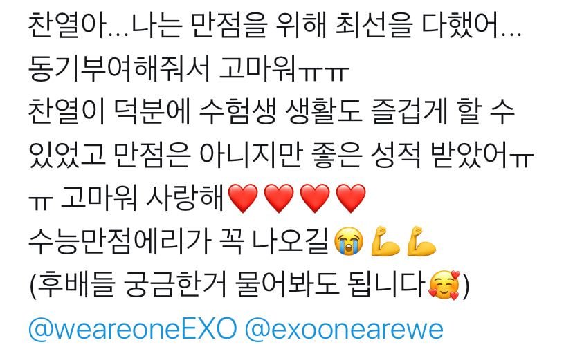 “Chanyeol-ah… Tam puan almak için elimden geleni yaptım.. Beni motive ettiğin için teşekkürler ㅠㅠ