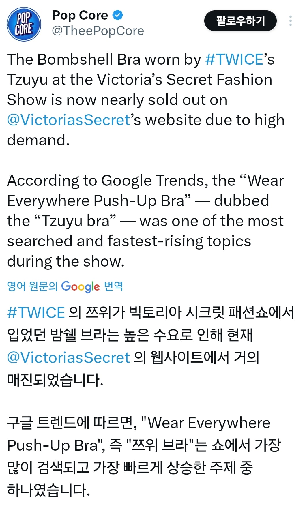 Google Trends’e göre, “Wear Everywhere Push-Up Bra” – namı diğer “Tzuyu sütyen” – defile sırasında en çok aranan ve en hızlı yükselen konulardan biri oldu.