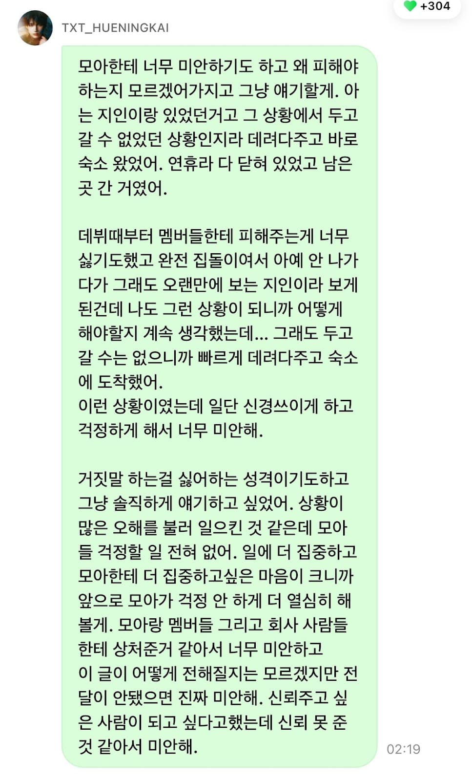 Yalan söylemekten nefret eden biriyim, bu yüzden size dürüstçe anlatmak istedim. Bu durumun birçok yanlış anlaşılmaya yol açabileceğini düşünüyorum, ama MOA’ların endişelenecek hiçbir şeyi yok. İşime ve MOA’lara daha fazla odaklanmak istiyorum, bu yüzden gelecekte endişelenmenize gerek kalmayacak şekilde daha çok çalışacağım. MOA’ları, üyeleri ve şirket çalışanlarını incitmiş olabileceğim için çok üzgünüm. Bu mesajın nasıl okunacağını bilmiyorum ve iyi anlaşılmamışsa özür dilerim. Güvenilir biri olmak istediğimi söylemiştim ve bunu başaramadığım için üzgünüm.” – KR Koreaboo