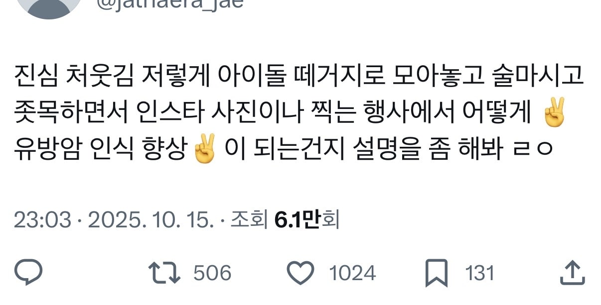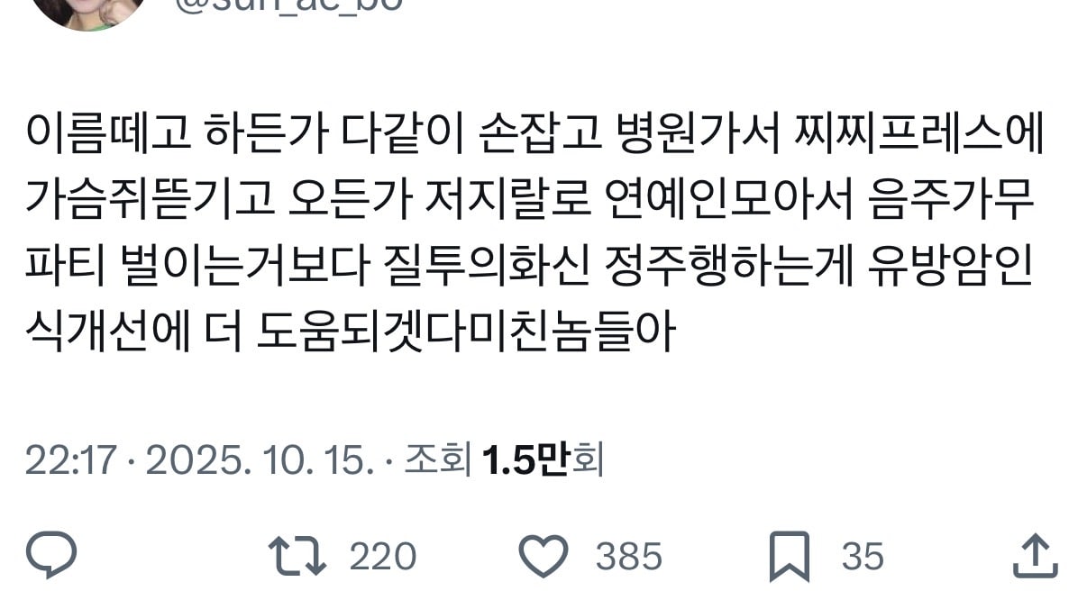 “Bu lanet olası ünlü partisi, sadece kendi aralarında içki içip bir moda şovu yapmak, meme kanseri farkındalığı ile ne ilgisi var? ㅋㅋ Hastalar iflas ediyor ve yeni ilaçlar sigorta kapsamında değil diye ölüyor, ama bu lanet olası ünlüler ‘farkındalık kampanyasına katılıyor’ diye alkollü kokularıyla dolaşıp odadaki masaları tarıyor. İğrenç, çalınmış iyi niyet, çalınmış hastalık.”