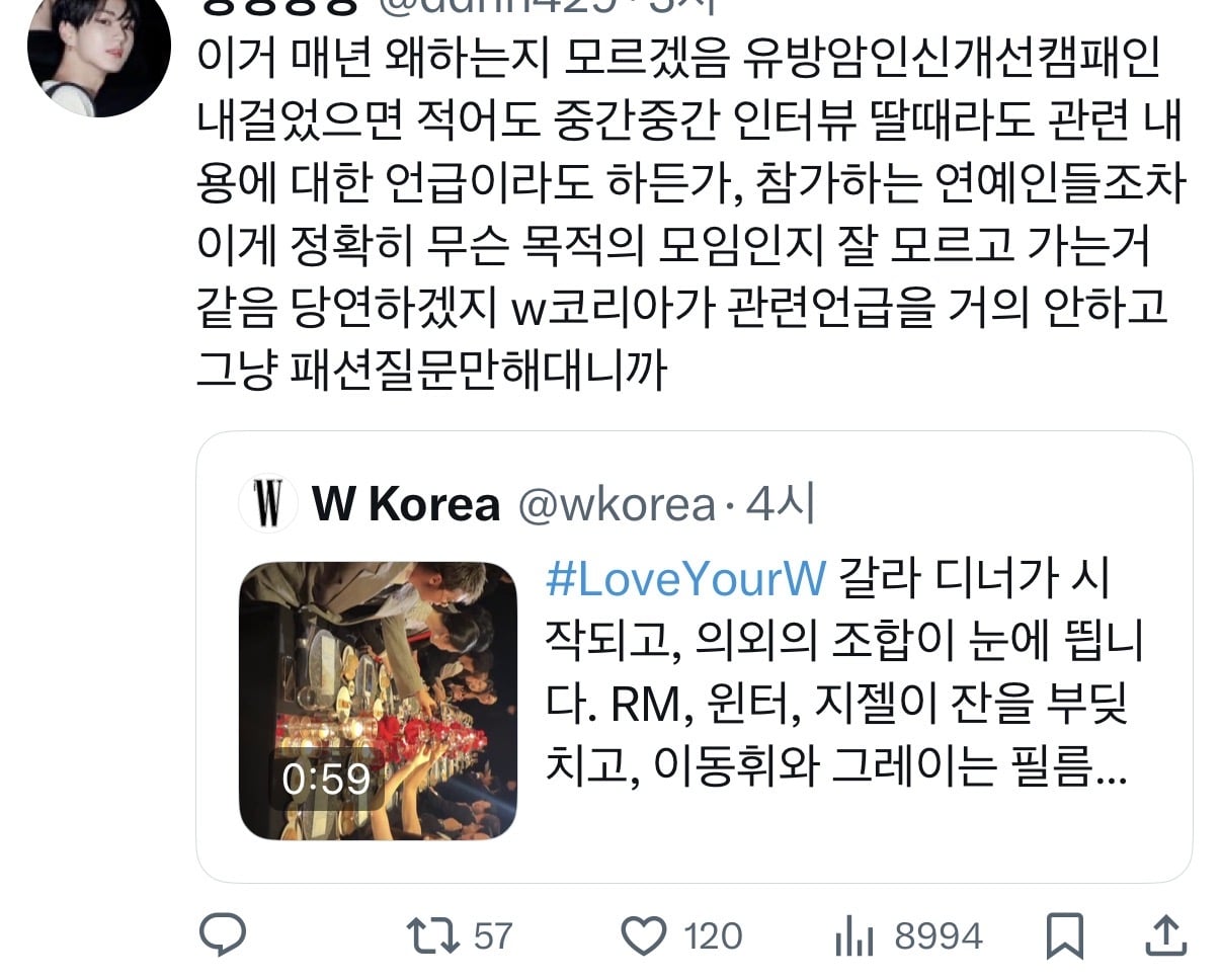 “Bunu her yıl neden yapıyorlar anlamıyorum. Eğer buna meme kanseri farkındalık kampanyası diyorsanız, en azından röportajlarda ya da etkinlik bölümlerinde konuyla ilgili bir şeyler söyleyin. Katılan ünlüler muhtemelen etkinliğin ne için olduğunu bile bilmiyor. Tabii ki bilmezler. W Korea neredeyse meme kanseri ile ilgili hiçbir şeyden bahsetmiyor, sadece moda ile ilgili sorular soruyor.”