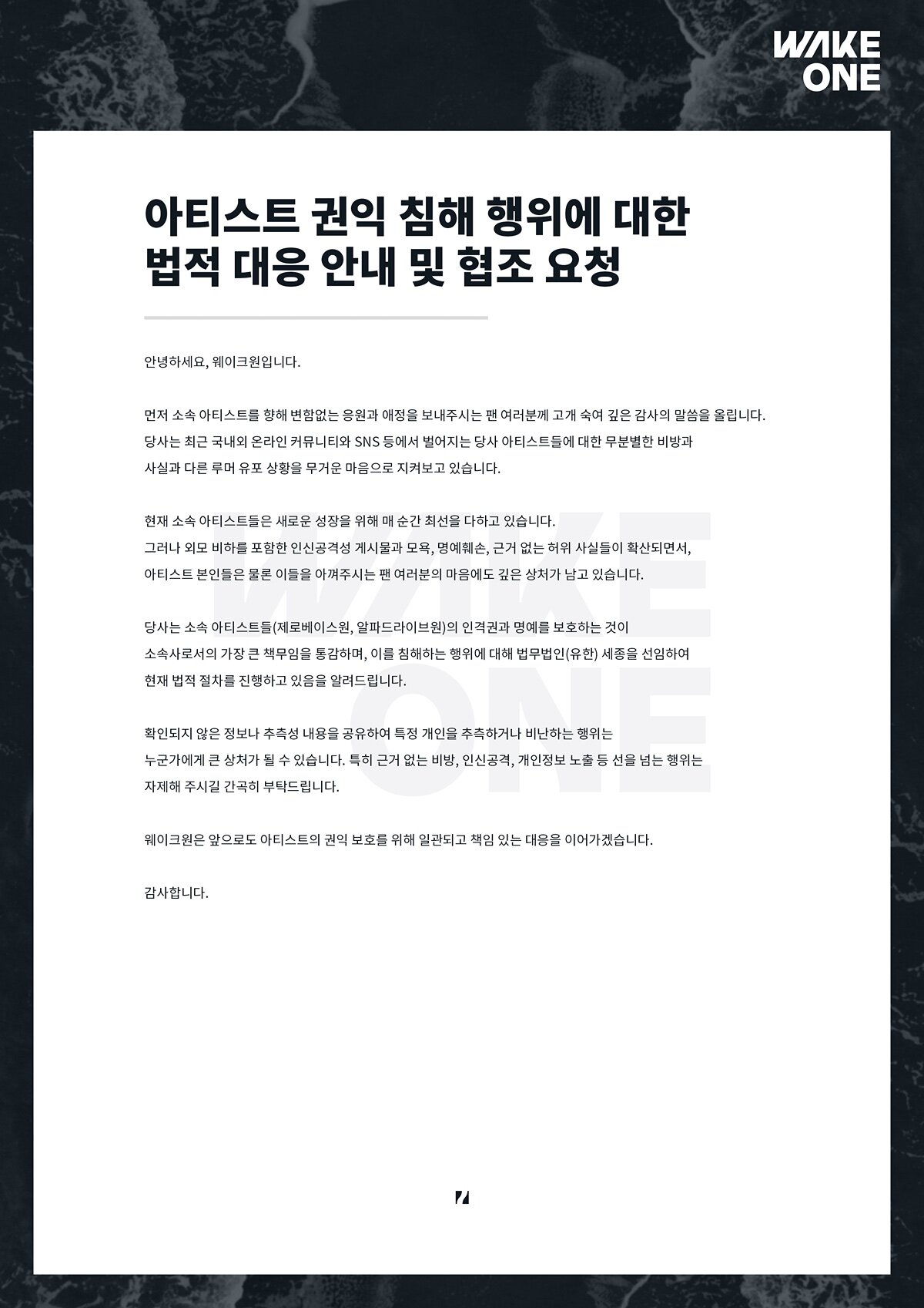 Sanatçılarımızın (ZEROBASEONE, Alpha Drive One) kişilik haklarını ve itibarını korumak, ajansları olarak en önemli görevimiz olduğunu tamamen kabul ediyoruz. Bu hakları ihlal eden her türlü eyleme karşı yasal işlem başlatmak üzere Sejong LLC hukuk bürosunu görevlendirdiğimizi duyururuz.
