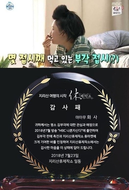 Gimbugak’a gösterdiğiniz sürekli ilgi ve sevginizden dolayı, ayrıca 2018 Temmuz ayında MBC I Live Alone programına katılarak gim-bugak satışlarının ve Jirisan El Yapımı Pazarı’nın tanıtımına büyük katkı sağladığınız için,